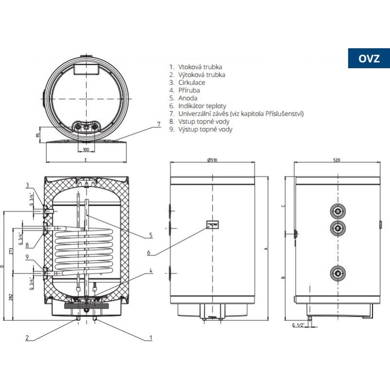 Ohřívače se vyrábějí pro připojení výměníku tepla z pravé (OVZ P) nebo z levé (OVZ L) strany. Součástí dodávky je pojistný ventil se zpětnou klapkou. Součástí instalace musí být čerpadlo ústředního topení, které není součástí dodávky.