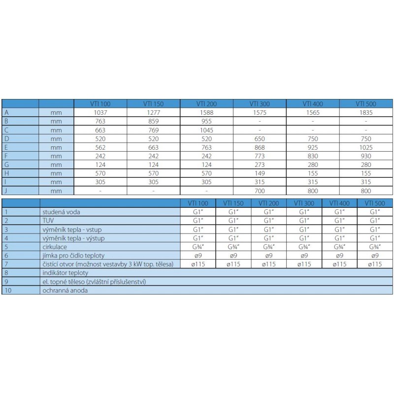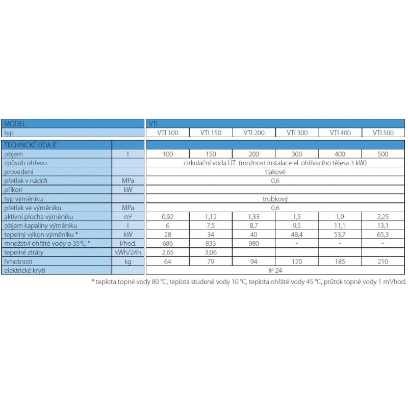 Ohřívače vody typu VTI jsou univerzální akumulační tlakové ohřívače s nepřímým ohřevem vody vhodné pro stacionární kotle ústředního vytápění. Díky vysokému výkonu a ekonomickému provozu jsou efektivně využitelné zejména při vysokém odběru teplé vody, přičemž na ně může být napojeno několik odběrných míst teplé vody ve více podlažích. Vysoký komfort přípravy teplé vody je zabezpečený rychlým a rovnoměrným ohřevem velkými vyhřívacími plochami. Nádrž ohřívačů je vyrobená z ocelového plechu, který je smaltovaný při teplotě 850°C, čímž společně s anodovou ochranou dosahuje vysoké odolnosti vůči korozi. Ohřev vody tepelnými výměníky sahajícími až ke dnu nádrže ohřívače zabraňuje vzniku kritických studených zón s choroboplodnými zárodky. Vývody z výměníku tepla jsou umístěné v zadní části a vývod teplé vody v horní části ohřívačů, což umožňuje jejich jednoduché připojení ke stacionárním kotlům ústředního vytápění. Ohřívače mají otvor určený k montáži snímače termostatu a v přední časti čistící přírubu pod plastovým krytem, kde je možné navíc nainstalovat přírubu s elektrickým ohřívacím tělesem s příkonem 3000 W.