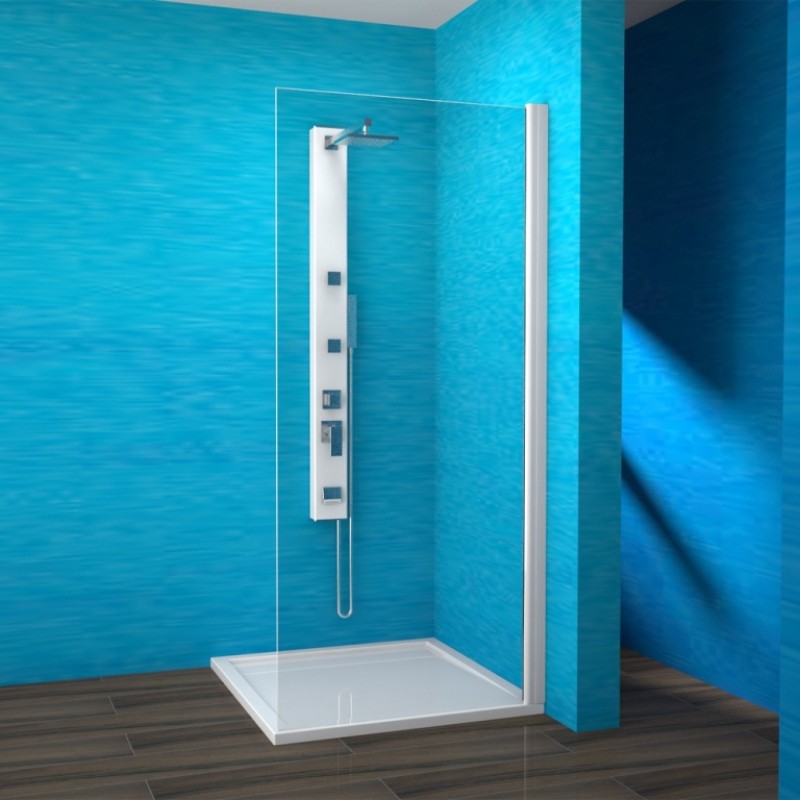 Bezrámová křídla z bezpečnostního skla tloušťky 6 mm řady EMOTION. Skleněná tabule je uchycená v nosném hliníkovém těle se zvedacím a otočným mechanismem na koncích. Přes čep mechanismu a upevňovací profily jsou zástěny uchyceny na zeď a ustaveny tak, aby umožňovaly pohodlné otevírání při optimální těsnosti. Profil zástěny je v bílém provedení nebo ve stříbrném eloxu. Nabízíme 4 varianty dveří v rozměrech 190x80, 190x90, 190x100 a 190x120.