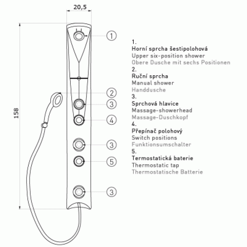 Oba masážní panely jsou osazeny sprchovou hlavicí a ruční sprchou. Termostatická baterie a polohový přepínač automaticky patří mezi součásti jejich výbavy.
