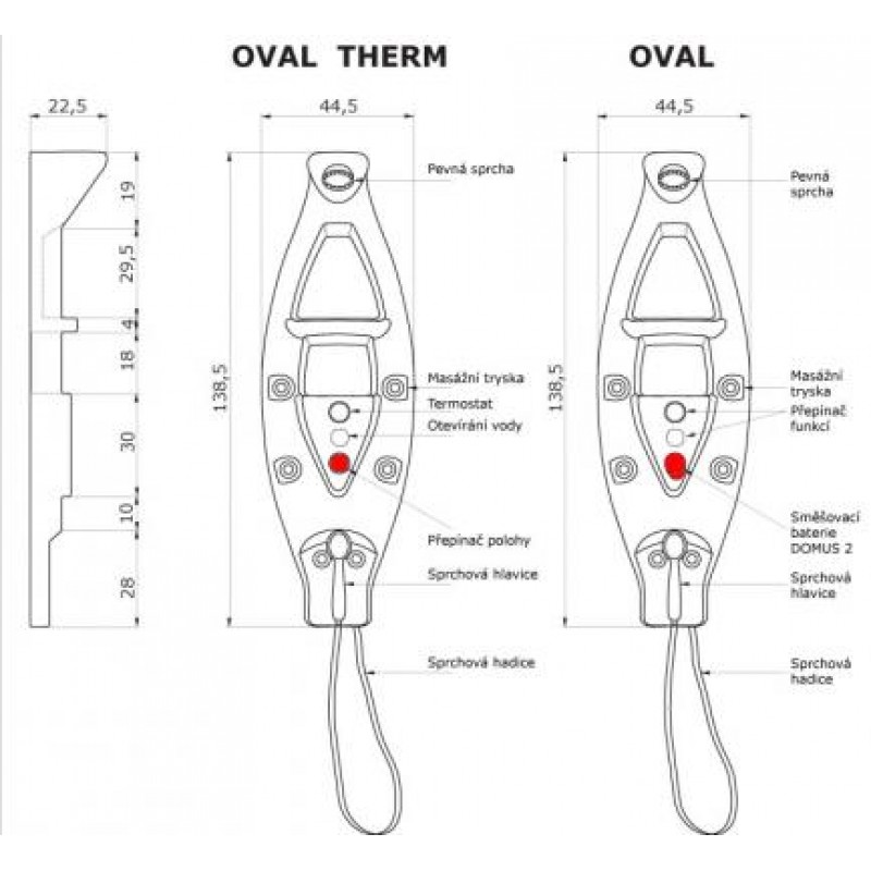 Už na první pohled je patrné, že OVAL THERM je upevněn na rovné zdi, nikoliv v rohu sprchového koutu. Je k dispozici ve dvojím provedení: s pákovou (OVAL) nebo termostatickou baterií (OVAL THERM) s přepínačem funkcí pro spouštění sprchy nebo šesti masážních trysek umístěných ve spodní polovině panelu. U obou ze dvou modelů je k dispozici jak sprchová hlavice, tak ruční sprcha. Masážní panely OVAL THERM jsou ideálním doplňkem všech moderních, ale i méně prostorných koupelen se sprchovými kouty například v panelákových bytech. Sprchové panely OVAL/OVAL THERM využívají tlaku vody z vodovodního řádu.