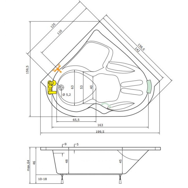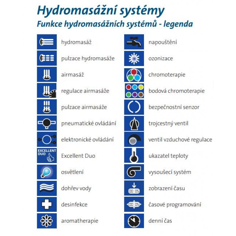 Výrobce si vyhrazuje právo upravit počty trysek v návaznosti na tvar vany. Ovladač elektronický, hydromasáže - cyklace masáže.