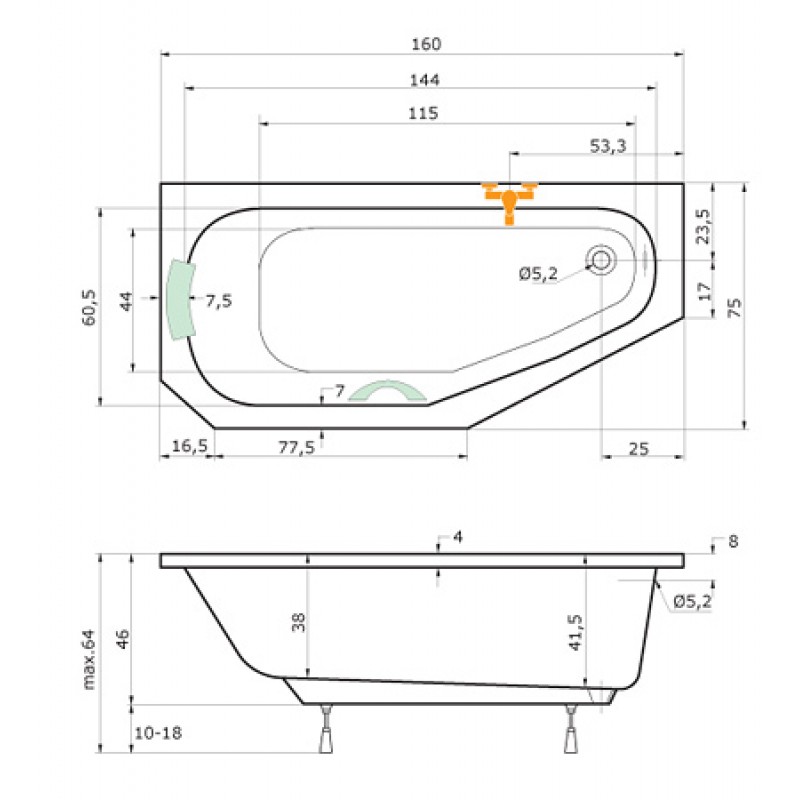 TEIKO Vana Panama L obdélníková 160 x 75 cm, akrylátová, bílá, levá V110160L04T04001Rozměry: 160 x 75 x 41 cm