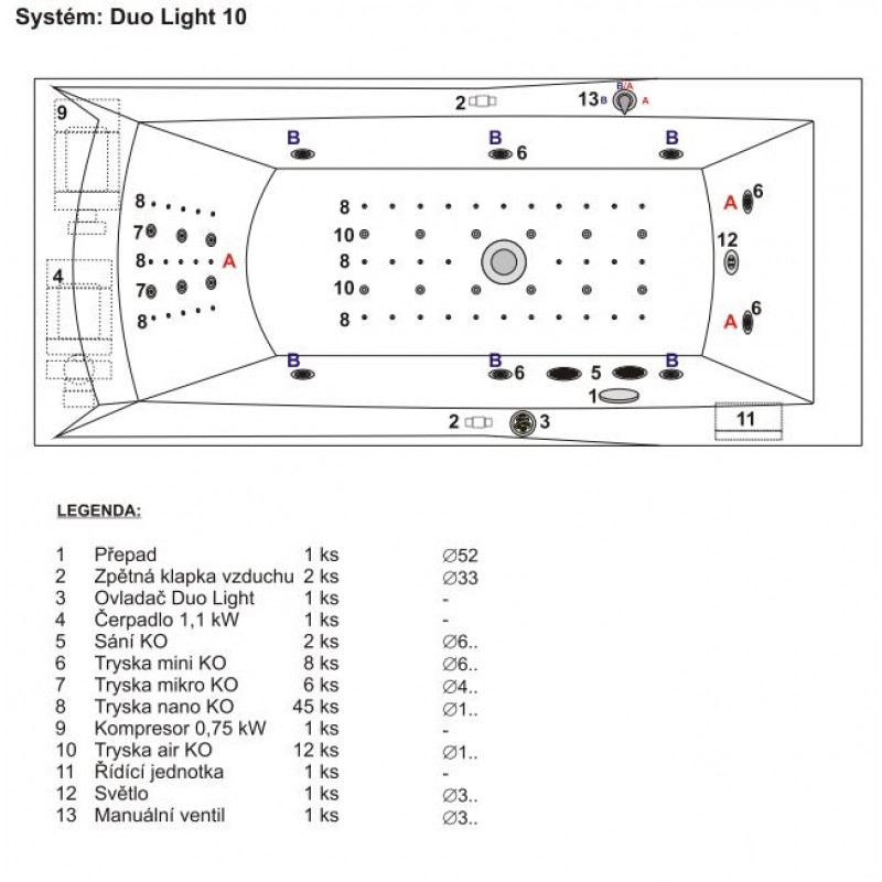 Vzduchové trysky - přivádí vzduch zdmychadla pro povrchovou relaxační masáž. Jsou instalovány do nohou.