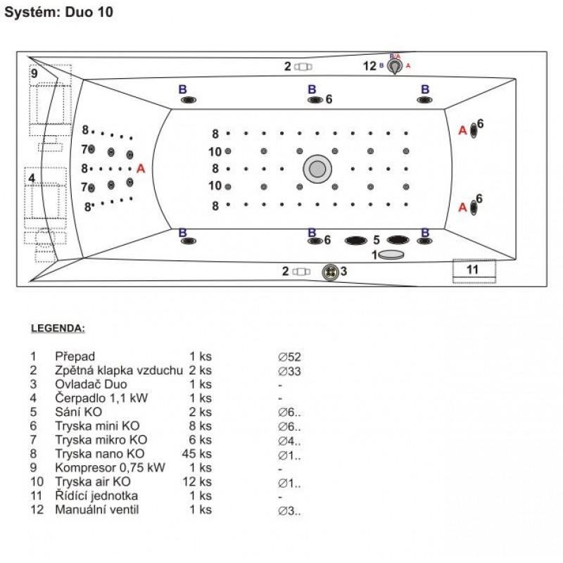 Vzduchové trysky - přivádí vzduch zdmychadla pro povrchovou relaxační masáž. Jsou instalovány do nohou.