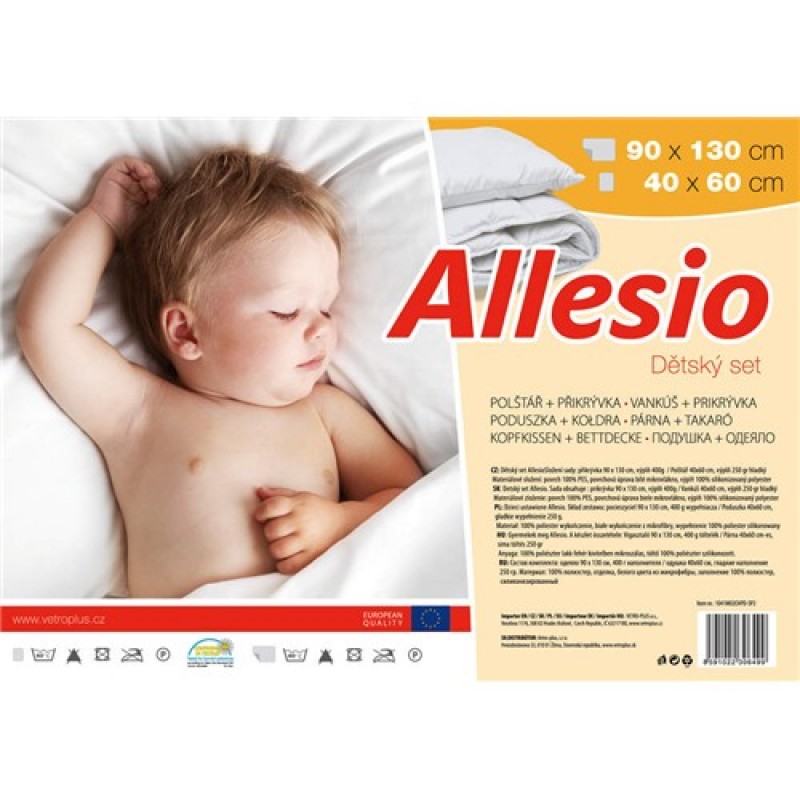 VETRO-PLUS Allesio polštář+přikrývka dětská 1041M02CHPD-SP2Polštář+přikrývka dětská Allesio - Dětský ložní set, přikrývka 90 x 130 cm, výplň 400gr., polštář 40x60 cm, výplň 250gr. Povrch: 100% PES, povrchová úprava bílé mikrovlákno, náplň silikonizovaný polyester.