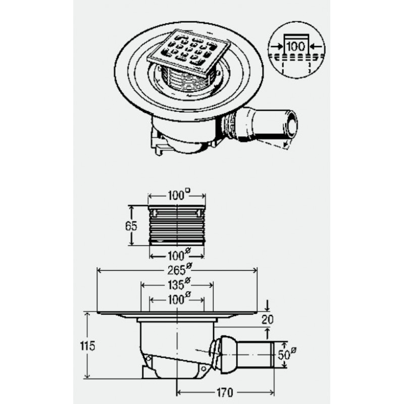 utěsňovací příruba, otočný a výškově nastavitelný nástavec 100x100 mm, zátka, rám z plastu, rošt z nerezi 1.4301,