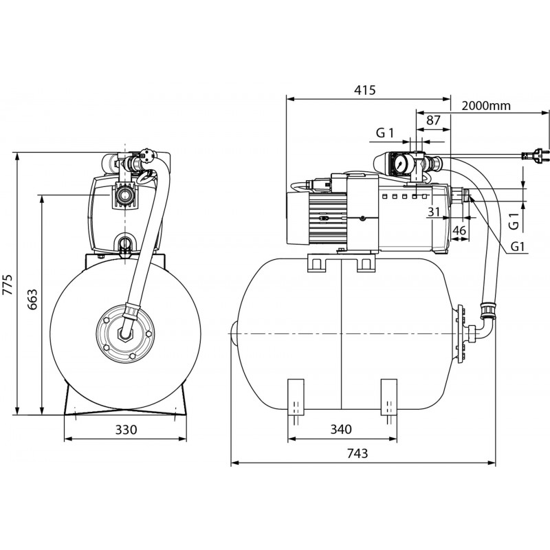 Systém je doplněn o membránovou tlakovou nádobu s robustní vyměnitelnou membránou EPDM, která zajišťuje stabilní tlak a dlouhou životnost. Součástí je také tlakový spínač, manometr, flexibilní tlaková hadice a elektrická rychlospojka. Motor má ochranu proti přetížení s automatickým resetem.