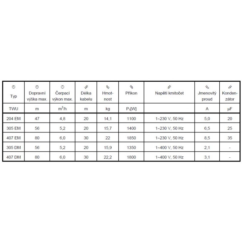 WILO ponorné čerpadlo TWU 5" - 305 EM A 2865546. Dopravní výška 56 m Průtok Q max 5,8 m3/h ----------------------------------------------------------------------------------Ponorné čerpadlo do vrtů od průměru 135mm, nebo studní libovolného průměru. Vhodné na zásobování vodou, zavlažování,nebo postřik. čerpadlo je zhotovené z nerezavějícího materiála. Jednofázová čerpadla pro 230V(označení EM) mají již zabudovanou ochranu motoru a nemusí se jistit.Třífázová čerpadla pro 400V (označení DM) je nutno jistit motorovým jističem na jmenovitý proud (TWU 5"-305 DM-3,0 A a TWU 5"-407 DM-3,6 A). Výtlak čerpadla je Rp 1 1/4". Maximální hloubka ponoru je 20m. Lano na spouštění čerpadla do vrtu a plovák je součástí.Obrázky se mohou lišit od originálního produktu/položky.