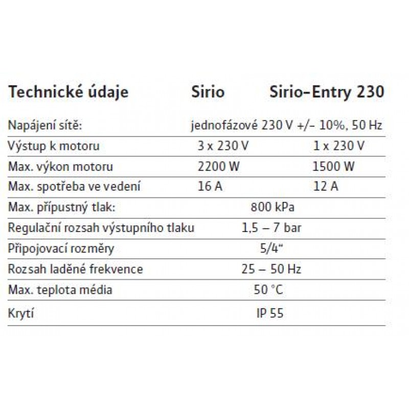 Regulátor, využívající frekvenčního měniče k plynulé regulaci otáček = nejúspornější regulace točivých strojů, nabízí kromě plynulého nastavení výstupního tlaku z čerpadla, také ochranu proti přetížení, nebo ochranu proti běhu na sucho. V případě zakoupení tohoto zařízení v setu s čerpadlem WILO jsou nastaveny hodnoty jištění již při prodeji. V případě zakoupení samostatného výrobku SIRIO, je přiložen podrobný návod umožňující seřídit regulátor na optimální hodnotyvčetně regulačních složek nebo zpožďovacích relé. Pro běžného uživatele proto zbývá jen snadné nastavení požadovaného tlaku.