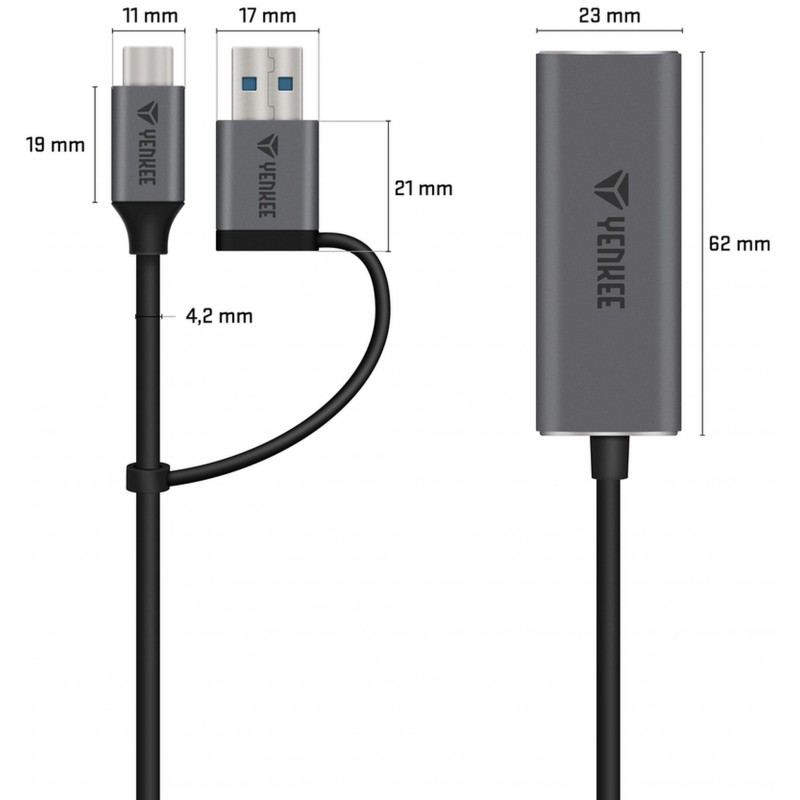 Nahraďte chybějící Ethernet RJ-45 port pomocí adaptéru 2v1 od YENKEE. Prostřednictvím USB A případně USB C konektoru vytvořte Ethernetové spojenní o rychlosti až 1 000 Mbps. Adaptér je vhodný pro použíti na PC, notebooku a mobilním telefonu. Široká kompatibilita je zaručena pomocí dvou vstupních konektorů USB 3.0 a USB 3.1 Gen. 1. Bezproblémový přenos dat o rychlosti až 10/100/1 000 Mbps umožňuje kvalitní chipset uvnitř adaptéru RTL8153. Pomocí funkce plug and play stačí adaptér připojit do vašeho zaření bez potřeby stahování ovladačů. Díky kompaktním rozměrům a hliníkovému tělu je adaptér ideální na cesty.